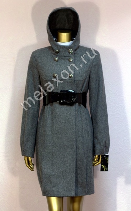 Женское демисезонное двубортное пальто с капюшоном и поясом.